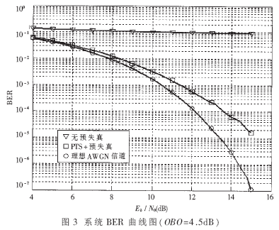 在OBO=4.5dB时,有/无预失真系统的误比特率曲线如图3所示。要使高功率放大器最有效地工作,需要在放大器最大输出功率与OFDM信号最小非线性失真之间进行折中,为此,定义系统的总退化TD(Total Degradation)为: