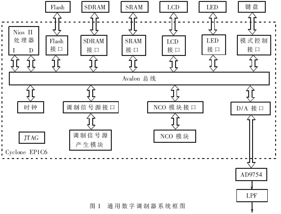 altera" title="altera">altera.com/">Altera公司的Nios II处理器是用于可编程逻辑器件的可配置的软核处理器。Nios II软核处理器和存储器、I/O接口等外设可嵌入FPGA中,组成一个可编程单芯片系统(SOPC),大大降低了系统的成本、体积和功耗。基于Nios II处理器系统的通用数字调制器是一种软件化硬件的解决方案,可以产生多种模式的数字调制信号,具有多功能性、通用性、集成度高、易于升级等优点,满足软件无线电系统的要求。