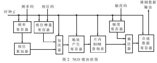 本系统在一个调制器中灵活多变地实现了多种调制功能。Nios II处理器完成人机交互和控制工作,FPGA逻辑从Nios II处理器接收控制信号和数据后完成相应的硬件功能。系统整体框图如图1所示。Nios II软核处理器、存储器和I/O接口等外设可嵌入在FPGA中,这样整个系统的数字处理部分全部集成在FPGA器件中。数控振荡器(NCO)的各子模块必须在Nios II处理器的控制下,不断接收实时数据才能完成各种不同的数字信号调制。在某些情况下,这些数据传输是复杂的,好在Nios II处理系统有Avalon总线,它规定了控制器与从属组件间的端口连接以及组件间通信的时序。NCO通过Avalon总线与Nios II处理器连接,可以简单地看成外围设备,很方便完成控制和数据传输。