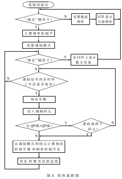 本系统的设计核心是根据调制信号的信息对载波频率、相位和振幅进行精确控制。通过Nios II处理器来改变上述三个参数中的一个或几个,以完成各种不同类型的调制。Nios II处理器的主要工作有:第一,针对不同的调制模式,输出对应的控制码;第二,对某一具体的控制码来说,要根据其控制信号的值、时钟速率、相位累加器、ROM以及DAC位数等计算出具体的码值。软件流程如图4所示。