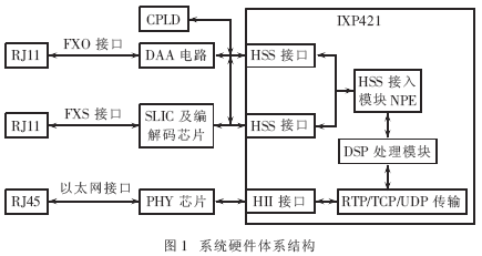 主处理器IXP421是INTEL公司IXP42x系列的网络处理器,它在VoIP应用方面具有自己的特点。如提供了两个高速同步串口HSS, 同时含有高速网络处理引擎NPE,在Xscale的配合下它可以实现DSP等高级数据处理的应用。并配有基于Xscale的DSP软件库,支持2~4路语音信号的处理。在网络处理方面,IXP421集成有10~100兆MAC,通过MII/RMII接口连接通用PHY芯片,并连至IP网络。