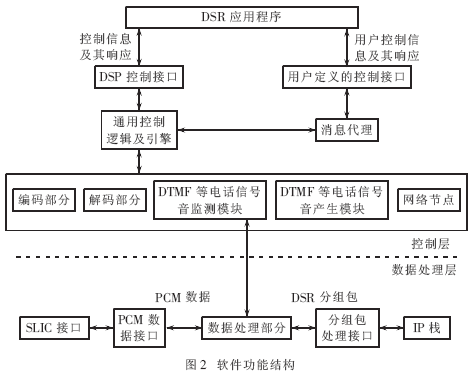 其中DSR模块是IXP421进行底层语音数据处理的模块,它主要采用由INTEL提供的DSR(DSP software release)软件库。一方面,它与上层应用程序" title="应用程序">应用程序进行通信,传递数据或响应来自上层的控制消息。另一方面,它与底层接口进行通信与控制。