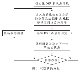 用于保存当前网关中各路话音的配置参数,num表示该路通话的本地号码和对端号码,addr表示该路通话对应在DSR内所使用的本地和远端网络地址,status记录本地终端在该通话中处于状态机中的状态。设备在加电启动后,需要按步骤进行一系列的初始化工作。包括一些记录状态信息的全局变量,初始化SLIC接口、DSR模块、网络接口、信令处理模块并开启所需的监控线程,等待控制状态的变化。