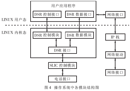 以内核态运行的程序主要包括SLIC控制模块" title="控制模块">控制模块、DSR控制模块及接口和DSR数据模块这三部分,它们基本完成了底层所需的功能要求。用户态的程序都是运行在其上,对其进行管理控制,以实现上层的应用。