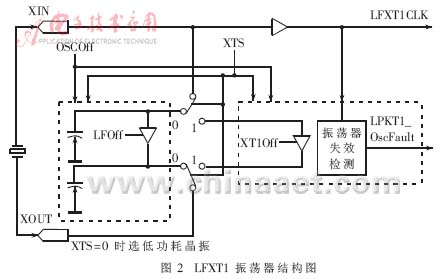 (1)LFXT1CLK 低频时钟源:由LFXT1振荡器产生(如图2所示)。通过软件将状态寄存器中OSCOff复位后,LFXT1开始工作,即系统采用低频工作。如果LFXT1CLK没有用作SMCLK或MCLK信号,则可以用软件将OSCOff置位,禁止LFXT1工作。