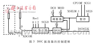 (3)DCOCLK 数字控制RC振荡器。由集成在时钟模块中的DCO振荡器产生。DCO振荡器是一个RC振荡器,频率可以通过软件调节,其控制逻辑如图3所示。当振荡器LFXT1、XT2被禁止或失效时,DCO振荡器被自动选作MCLK的时钟源。因此由振荡器失效引起的系统中断请求可以得到响应,甚至在CPU关闭的情况下也能得到处理。
