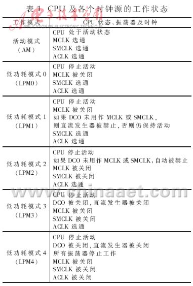 由基础时钟模块可以提供系统所需的3种时钟信号,即:ACLK、MCLK、SMCLK。其中辅助时钟ACLK是LFXT1CLK信号经1、2、4、8分频后得到的。ACLK可由软件选作各个外围模块的时钟信号,一般用于低速外设;系统主时钟MCLK可由软件选择来自LFXT1CLK、XT2CLK、DCOCLK三者之一,然后经1、2、4、8分频得到。MCLK主要用于CPU和系统。子系统时钟SMCLK可由软件选择来自LFXT1CLK和DCOCLK,或者XT2CLK和DCOCLK,然后经1、2、4、8分频得到,主要用于高速外设模块。系统可以根据实际需要通过软件来选择合适的系统时钟频率,这三种不同频率的时钟输出给不同的模块,从而合理利用系统的电源,实现整个系统的超低功耗,这一点对于电池供电的系统来讲至关重要。在具体应用中,CPU及各个时钟源的工作状态如表1。