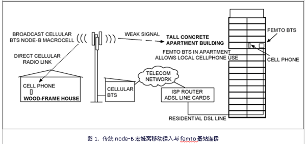图1右侧是混凝土高层公寓,公寓中安装有femto基站。Femto基站通过有线DSL接入网络。如图中所示,宏基站到高层公寓的信号很弱,femto基站作为“私有、专用基站”,不与宏基站进行通信。