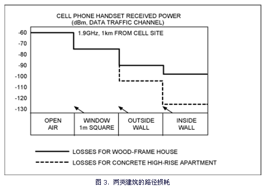 图3所示为两类建筑的路径损耗,由于许多3G手机需要高于-110dBm的接收功率才能实现可靠的IP数据服务,可以看出,在混凝土建筑中,接收灵敏度已经低至无法为客户提供数据服务的程度。