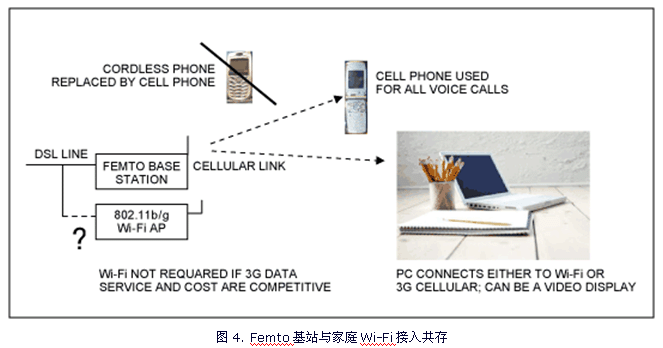 图4所示为femto基站与家庭Wi-Fi共存,取代无绳电话的情景。