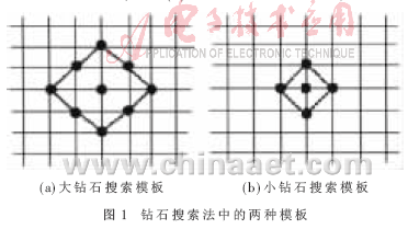 圆上的任意一点到圆心的距离都是相同的,如果能利用圆形作为匹配模板,则该模板在各个搜索方向都具有相同的搜索速度。但考虑到计算的复杂度和图像序列的实际情况,本文采用六边形搜索法,包含如图3(a)所示的大六边形模板(HSP)和如图3(b)所示的小钻石模板(SDSP)。