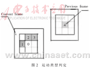 预测搜索起始点的方法有中值法、加权法和SAD比较法。本文采用SAD比较法,选取与当前块相关性最强的三个空间相邻子块(上方、左方和右上方的子块)和参考帧中相同位置的对应点作为侯选点进行预测(即如图2中的块1,2,3,4),比较当前块与上述块的绝对误差和SAD,然后选取SAD最小的块作为预测起点。