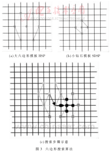搜索时,先用HSP模板进行粗定位,当最小块误差点出现在中心点处时,可以认为最优点位于六边形所围的区域内。这时再用SDSP模板准确定位,SDSP模板5个点中误差最小的点就是最优匹配点。六边形搜索法的搜索过程如图3(c)所示,具体搜索过程如下: