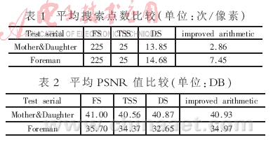 观察表1可以发现,对于小运动序列“Mother & Daughter”,FS算法需要搜索225个点,DS算法需要13.85个点,而本文提出的算法只需要计算2.86个点就可以找到最优运动矢量。对于大运动序列“Foreman”,也有效地降低了搜索点数。