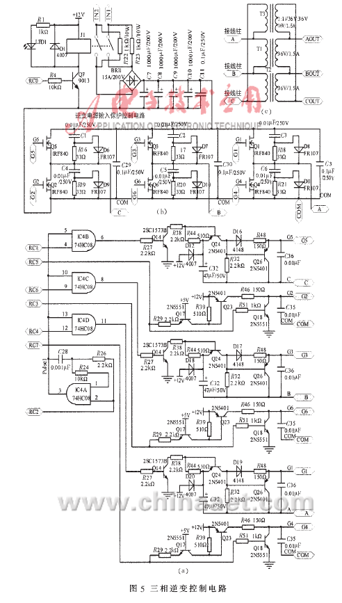 三相逆变控制是本硬件设计的核心电路。图5是三相逆变控制电路。图5(a)用来产生三相逆变控制电路图5(b)六个晶体管所需的控制信号。G1、G3、G5控制信号产生原理一致,G2、G4、G6控制信号产生原理一致。G1控制过程如下:单片机RC2引脚产生的PWM信号经与门延时,在RC4的控制之下加到Q14,当Q14基极为低电平时,Q14截止,Q24截止,Q26导通" title="导通">导通,加在晶体管Q1的栅、源极的电位近似相等,Q1截止;当Q14基极为高电平时,Q14导通,Q24导通,Q26截止,在电解电容C32的自举下,加在晶体管Q1的栅、源极的电位差为12V,使Q1导通。G2控制过程如下:当RC5为高电平时,Q17、Q23截止,Q18导通,晶体管Q2栅极为低电平,Q2截止;当RC5为低电平时,Q17、Q23导通,Q18截止,晶体管Q2栅、源极电位差为12V,Q2导通。在单片机的控制下,可产生图5(b)的Q1~Q6晶体管的时序信号波形,其具体时序波形如图6中的G1~G6波形。
