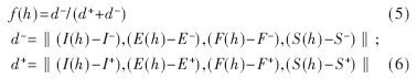 (2)适应度函数的构造:采用“理想点法”构造多目标函数的适应度函数,决策者可以给出每个目标函数的乐观值(正理想点)和最不能够接受的悲观值(负理想点)。在状态空间中定义出一个正理想点(I+,E+,F,+S+)和一个负理想点(I-,E-,F-,S-),即得适应度函数: