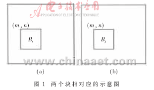 传统的方法在搜索最佳匹配块时,直接对样图进行全局搜索,若样图较大将导致合成时间过长。在纹理合成之前先对样图进行二维小波分解,将样图分解为低频、水平高频、垂直高频、斜线高频四个部分。由于低频部分包含了样图大部分的能量,所以合成时只在低频部分搜索最佳匹配块,这样在很大程度上减少了搜索时间。对于其他部分则不再进行最佳匹配块的搜索,而是将其内部与在低频部分搜索到的最佳匹配块相对应的块作为最佳匹配块。如图1 所示,Bi块的左上角在图1(a)中的位置为(m,n),Bj块的左上角在图1(b)中的位置也是(m,n),则认为Bj块是Bi块在图1(b)中的对应块。这样就使全局搜索时的样图缩小为原样图的1/4,从而很大程度上缩短了搜索时间,提高了合成速度。四部分合成完以后,再通过小波重构" title="重构">重构得到输出图。