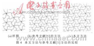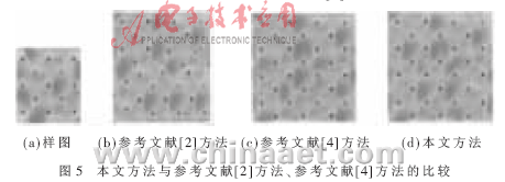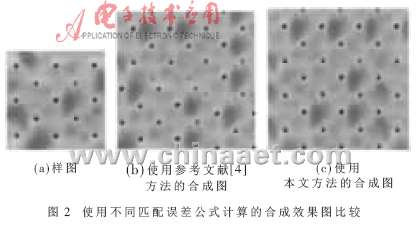 式中,Ah+Al=A(重叠部分像素的个数),Ah、Al分别代表高频系数和低频系数的个数,α、β分别代表高频系数和低频系数所占的比重,搜索时选择d(Bi,Bj)最小的块作为当前块Bi的最佳匹配块。图2是使用不同匹配误差公式计算的合成效果图的比较。由图可以看出,对纹理块的重叠部分进行三层小波分解时,使用参考文献[4]方法计算匹配误差的合成效果图图2(b)中存在纹理错位、结构杂乱现象,与样图的纹理结构有较大出入,而使用本文方法的合成图较好地保持了原样图的结构,如图2(c)所示(其中α=2,β=1)。