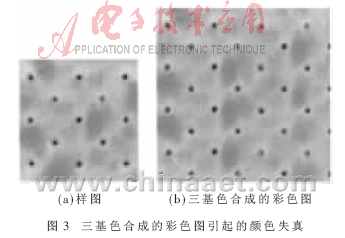上面的方法因为需要进行小波分解与重构,所以仅对灰度图适用。对于彩色纹理,由于每一个像素点都由R、G、B三基色表示,可以对三基色分别进行合成,但是这样会引起颜色失真,如图3所示。借鉴参考文献[5]的方法,使用KL变换解除R、G、B三基色的相关性,将彩色纹理变换成相互独立的三分量I1、I2、I3,然后对每个独立分量用上面提出的方法进行合成,生成相应的纹理图像,最后将三幅纹理图像变换回R、G、B彩色空间,生成最后的彩色纹理。