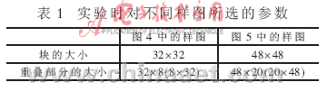 实验中纹理块的大小对合成结果有较大影响,如果纹理块太小,则块内包含的信息较少,将导致合成的结果呈现较大的随机性,不能很好地匹配当前块;纹理块太大的话,每次小波变换的时间会较长。所选纹理块的尺寸一般应该能够涵盖一个纹理基本元素,重叠部分取纹理块的1/4~1/2。表1给出了实验时对于不同样图所选的参数。