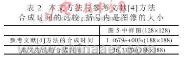 图4给出了本文方法与参考文献[1]方法的比较,可以看出本文方法克服了参考文献[1]方法引起的纹理错位的问题。图5给出了本文方法与参考文献[2]方法、参考文献[4]方法的比较。可以看出,本文方法和参考文献[4]方法在效果上都优于参考文献[2]方法,较好地克服了参考文献[2]方法引起的纹理错位,结构杂乱的问题。而且,由表2可以看出本文方法的合成时间明显少于参考文献[4]方法的合成时间。为了比较其效果,实验时对不同方法选择了相同的初始点。实验所用时间为多次实验的平均。