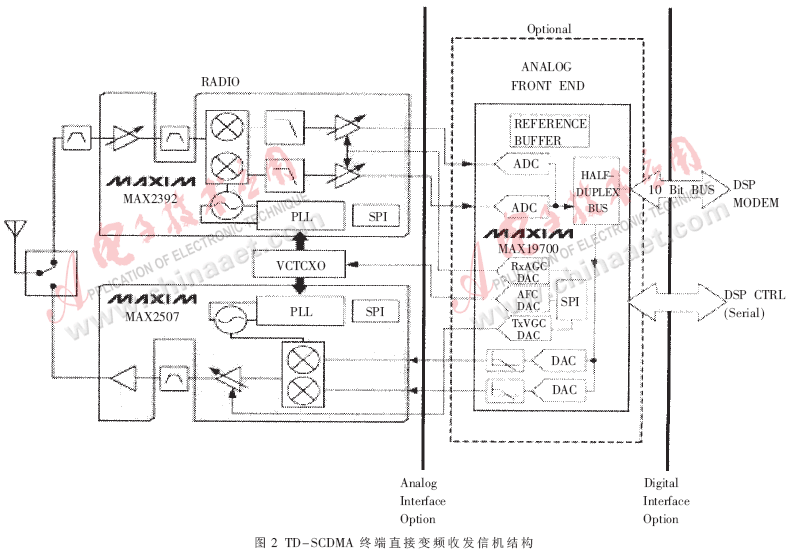 模拟前端单元MAX19700主要完成两个功能:基带数据的A/D变换和D/A变换;发射接收时的链路自动增益控制(AGC)和压控恒温晶振的自动频率控制(AFC)。在信号发射时, MAX19700通过10bit数据总线接收来自信号处理器(DSP MODEM)的数字基带信号,经过D/A变换、低通滤波后将模拟基带I/Q信号送至射频发射单元,完成基带I/Q信号到频带信号的变换。AGC功能和AFC功能是通过DSP串行控制线(DSP CTRL)实现的。