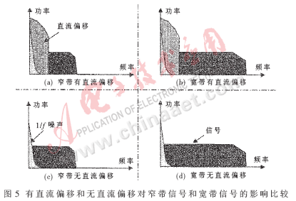 图5(a)~(d)对窄带有直流偏移和没有直流偏移以及宽带有直流偏移和没有直流偏移的情况分别作了图示说明。由各图比较可知,直流偏移对窄带信号的影响非常大,而对宽带信号(扩频信号)的影响相对要小很多。
