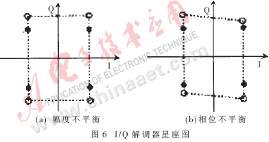 I/Q解调器在I/Q两个支路产生幅度和相位的不平衡,将使解调后的基带信号星座图产生失真,如图6所示。I/Q信号的相位和幅度的不平衡性可以通过匹配或模拟和数字(DSP)的校准方法得到解决。