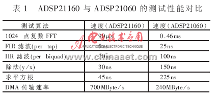 ADSP21160是AD公司的第二代SHARC处理器,与第一代SHARC处理器ADSP21060相比,处理能力得到了大幅度的提升,单片ADSP21160具有5片ADSP21060的运算能力,两款处理器的测试性能对比如表1所示。