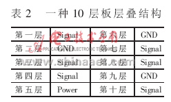 进行高速电路设计时,良好的印刷电路板层叠结构和板层定义及精心的布局布线,可有效地控制信号线的阻抗,降低信号的反射,使得大部分信号线的串扰被控制在允许的范围内,满足信号完整性的要求。而电路板上仍然存在信号完整性问题的信号线可通过终端阻抗匹配予以解决。在本设计中,根据所选电路板形(VME6U板)、ADSP21160信号线的密集程度和信号完整性的约束条件,采用了如表2所示的层叠结构,信号层与地层或电源层相邻,地层和电源层紧靠,层叠基本对称平衡,可获得较好的信号完整性环境。