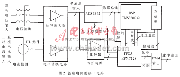 电压检测使用三相变压器,电流检测使用HL电流传感器。电平转换电路用来将检测到的信号转换为0~5V的电平。A/D" title="A/D">A/D转换器选用ADS7862。保护电路使用电压比较器311得到过压/过流故障信号。