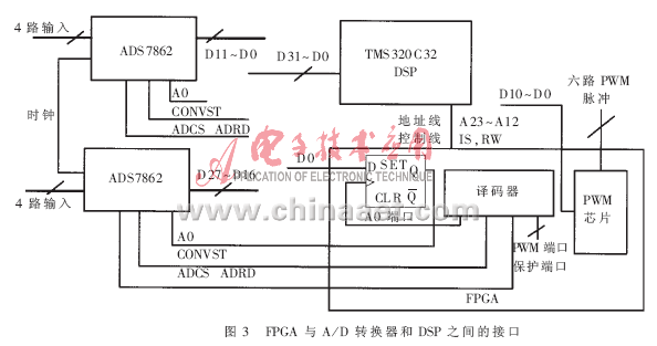 系统中使用了两片ADS7862,它们的控制线使用同样的接口,数据线则分别和DSP的高/低16位数据线中的低12位相连接。这样DSP可以同时控制两片A/D转换器:4通道同时转换;每次读操作可以得到两路数据。