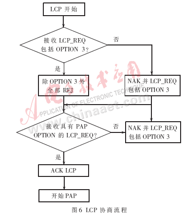 LCP阶段[2]主要通过交换数据包与访问集中器建立和配置链路,LCP流程如图6所示。由于ISP提供商可能会不同,所接收到的LCP_REQ中包含的选项也可能不同,但其中必然包括OPTION3,表示链路所用的认证协议" title="认证协议">认证协议(Authentication Protocol)。实践中根据与ISP的PPPoE过程的数据包分析,多数ISP采用PAP(Password Authentication Protocol)认证协议。也有的ISP采用CHAP(Challenge Handshake Authentication Protocol)认证协议,双方可以通过协商采用合适的认证协议,本文采用PAP。