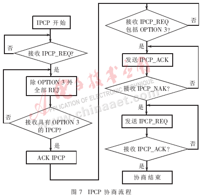 IPCP阶段[4]的目的是获取ISP方提供的IP地址,流程如图7所示。所以在IPCP阶段的协商主要针对OPTION3进行。PPPoE模块首先接收服务器端一个IPCP_REQ,这个IPCP_REQ包括OPTION3(其IP地址值通常无效);接着PPPoE模块发送一个IPCP_ACK,ISP方会响应一个带有有效地址的IPCP_NAK;然后PPPoE模块就以这个地址再发一个IPCP_REQ,ISP服务器回应IPCP_ACK,IPCP结束。此时PPPoE模块得到了服务器分配的有效IP地址,随后就可以在PPPoE协议之上传送IP数据包。需要注意的是,在PPP协商过程结束后,服务器为了检验接入方链路的活动状态,会定期发出LCP Echo-Request请求,此时PPPoE模块需要发送LCP Echo-ACK作为应答。