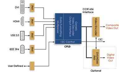 从USB和IEEE 1394等接口输入的不同数据总线首先要进入通用I/O引脚。第二步是将并行的视频数据转入类属视频总线,从而允许复用或选通以播放。I2C的参考设计用于控制PLD和板上ASSP的配置。