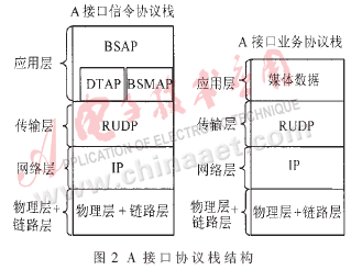 信令和业务子接口协议栈的物理层、数据链路层和网络层协议均采用商售以太网交换机上的标准协议。传输层采用本系统的专利技术:RUDP协议代替了传统的七号信令SCCP。信令子接口应用层内容基本对应3GPP2的IOS4.1版本规范A1接口中的基站管理应用部分(BSMAP)和直接传递应用部分(DTAP);业务子接口应用层内容以媒体数据为主。
