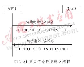 在A1接口上以目的设备ID(D_DID)、目的处理ID(D_CID)和源设备ID(S_DID)、源处理ID(S_CID)组成的四元组唯一标识一个信令连接。信令连接以一次握手的机制建立。连接建立方首先发送源处理ID为空的连接起始建立消息,接收方进行处理后回送的第一条消息为本次处理申请的处理ID,双方连接建立完成。所有信令均基于有连接方式传送,连接建立的流程如图3所示。