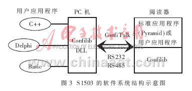 在该方式中,通信器S1503利用Confilib库函数或其它软件开发的主机程序进行控制,系统的智能部分在主机,通信器不做任何逻辑判断。当主机应用程序调用Confilib函数时,自动将Confilib命令翻译成ConfiTalk命令,然后传递给S1503,S1503根据该命令执行对应的Confilib命令。这种方式的优点是:与通信器应用程序Pyramid控制方式相比,拥有更加方便的界面,主机应用程序更加便于开发、调试;缺点是:执行速度慢。