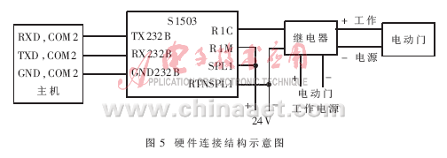 门禁系统包括通信器(S1503)、电动门和若干标签(S1251)。硬件连接结构示意图如图5所示。S1503通过串行口与主机相连,并且通过继电器对电动门实现控制。