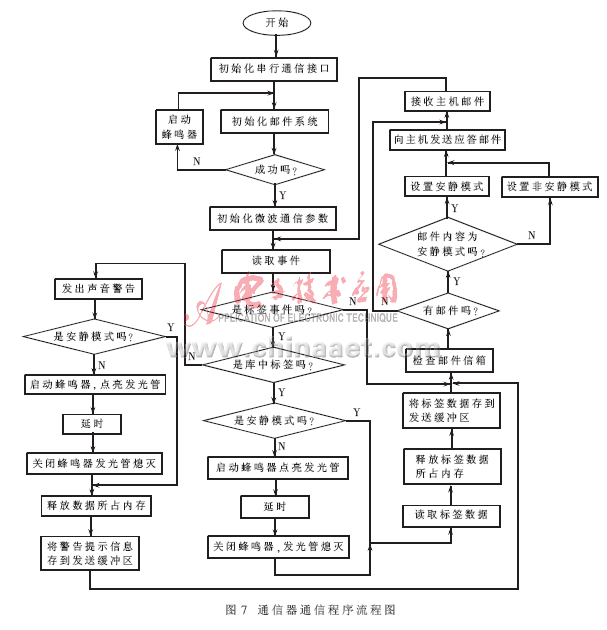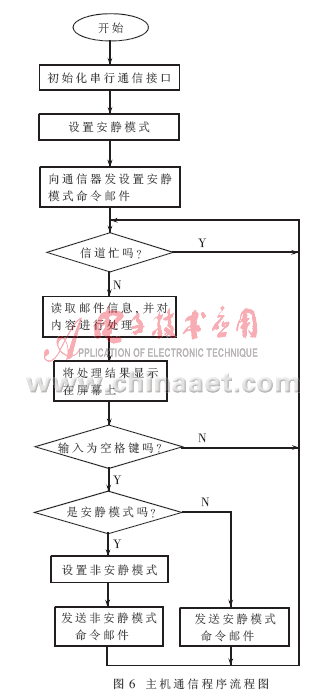 在该系统中,利用CONFIDENT软件库提供的邮件交换系统实现通信器S1503与主机的通信。使用邮件交换系统的程序流程图如图6和图7所示。其实现功能是主机接收到通信器发送来的标签邮件后,立即对邮件内容进行处理,并将与标签对应的车牌号显示在屏幕上。为了避免主机和通信器同时控制串行口而产生矛盾,系统规定:每当空格键被按下时,改变通信器的安静模式。通信器在安静模式时阅读标签事件,并将标签数据通过邮件发送给主机,主机通过邮件将通信器设置为非安静模式并在通信器为非安静模式时读取标签数据邮件。在程序实现时,利用定时器事件,主机应用程序每隔30秒自动输入空格键来达到此目的。