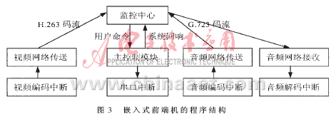 前端机的应用程序由主控制、视频编码中断、视频网络传送、音频编码中断、音频网络传送、音频网络接收、音频解码中断和串口中断等几个任务组成,各个任务的关联如图3所示。