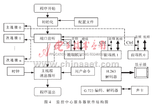 · 通过局域网向前端机发送用户控制指令,如前端机的选择、视频通道的选择、调节图像参数(包括帧速率、码流量的大小、色度、亮度、饱和度和对比度)、声音编码音量的大小等;