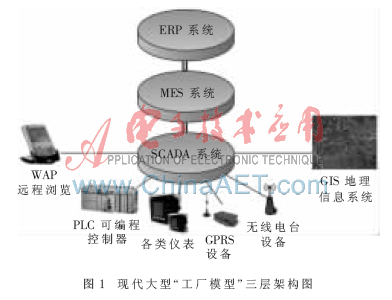 随着现代化工业生产规模的日益扩大,工业自动化应用日益呈现规模化、复杂化和广域分布化的特点。信息化时代的到来,使得用户对SCADA系统的功能和结构都提出了更高的要求。Internet、FCS、GSM、GPRS等网络技术的发展,GIS、GPS、面向对象技术、神经网络技术以及Java等技术的融入,SQL、ODBC、OPC的标准的完善,也为SCADA系统纵向上与MIS、MES、EPR等系统的集成,横向上与GIS、视频系统、WAP等综合应用提供了技术支撑。图1所示为现代大型“工厂模型”三层架构图。