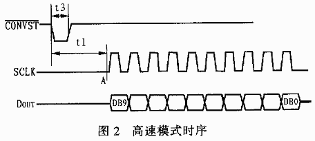 图2是AD7810工作在高速模式时的时序图。在此模式下,启动信号CONVST一般处于高电平。在CONVST端输入一个负脉冲,其下降沿将启动一次转换。若采用内部时钟,那么,转换需要2μs的时间(图中t1)。当转换结束时(图中A点),AD7810会自动将转换结果锁存到输出移位寄存器中。此后,在每一个SCLK脉冲的上升沿,数据按由高到低的原则(首先发送DB9,最后发送DB0)依次出现在DOUT上。如果在转换还未结束之前就发出SCLK信号来启动数据输出,那么,在DOUT上出现的将是上一次转换的结果。