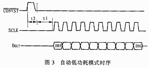 图3是AD7810工作在自动低功耗模式时的时序图。在此模式下,启动信号CONVST为低电平时,器件处于低功耗休眠状态。当在CONVST端输入一个正脉冲时,可在其上升沿将器件从休眠状态唤醒,唤醒过程需要1μs的时间(图中t2)。当器件被唤醒后,系统将自动启动一次转换,转换时间也是2μs(图中t1)。转换结束时,AD7810将转换结果锁存到输出移位寄存器中,同时自动将器件再一次置于低拉耗状态。