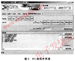 PC软件利用串口 控件,通过串口对阅读器发送相关命令,从而实现阅读器的设计,PC端程序界面如图6所示,通过实验,能准确操作TypeB卡。
