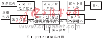 JPEG2000基于小波变换,放弃了离散余弦变换的区块编码方式,采用以小波转换为主的多分辨率的编码方式,将图像分解成不同分辨率。每种分辨率包括四种子带:水平和垂直方向都低通的LL子带、水平高通垂直低通的HL子带、水平低通垂直高通的LH子带、水平和垂直方向都是高通的HH子带。每种分辨率与子带对图像的重构贡献不一样。根据小波分解后小波系数的特点,JPEG2000采用了最佳截断嵌入式码块编码EBCOT对小波系数进行编码,EBCOT将小波分解后的子带分成互不重叠的编码块(例如块的大小64×64),然后对每个编码块的系数进行独立的比特层编码,对每个比特层都用重要性传播过程扫描、幅度精确过程扫描和清理过程扫描三种方式;接着对每种扫描的结果采用四种编码方式:重要要性编码、符号编码、幅度精练编码和清理编码。这些编码都采用基于上下文的MQ算术编码,因此每个编码块都独立生成一个编码流,然后根据后压缩率失真优化PCRT-opt算法将每个编码流分成若干段,每段码流长度的失真长度斜率从大到小排列,可以将大于某个失真长度斜率的所有编码块的编码流组合在一起形成一个质量层。EBCOT的最大特点就是将位流的生成和组合分开进行,这样可根据需要灵活处理码流的生成。