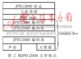 运动JPEG2000标准是在JPEG2000标准的第三部分定义的,称为MJPEG2000,其文件格式如图2所示。MJP2 可以在一个文件里包含一系列JPEG2000图像和时序,还可以容纳背景声音和元数据。用户可以编辑、显示、交换和流媒体化图像序列。Motion JPEG2000是一种针对图像序列的标准,在一个单独编解码器中同时支持无损和有损压缩。它允许一个或多个JPEG2000压缩图像序列,与声音、元数据同步后,存储为MJ2的文件格式。