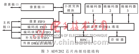 ADV202作为解码器时,则像素接口和像素FIFO作为输出,编码流FIFO接收JPEG2000编码流,图3是ADV202的内部模块。