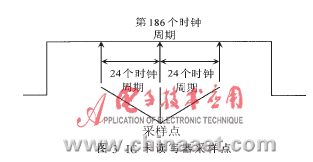 该通信程序采用ISO 7816-3字符协议标准编制。使用T=0,即字符协议,主要实现与IC卡的通信。由于选用的时钟为3.57MHz,在IC卡I/O口默认的9600bps通信速度下,每隔372个系统时钟脉冲,I/O状态可能变化一次。所以,为了准确读取IC卡I/O状态,在IC卡输出的每一位脉冲中间,即I/O启动186个时钟周期后,读取I/O状态。为了排除可能的干扰,在186个时钟周期的两侧再采样两点,共取样三点。三个采样点之间每两个点间隔24个时钟周期。如果三点取样值都为1,则输出为1;如果三点取样值都为0,则输出为0;如果三点取样值中有两点为1,一点为0,则输出为1;如果三点取样值中两点为0,一点为1,则输出为0。如图3所示。